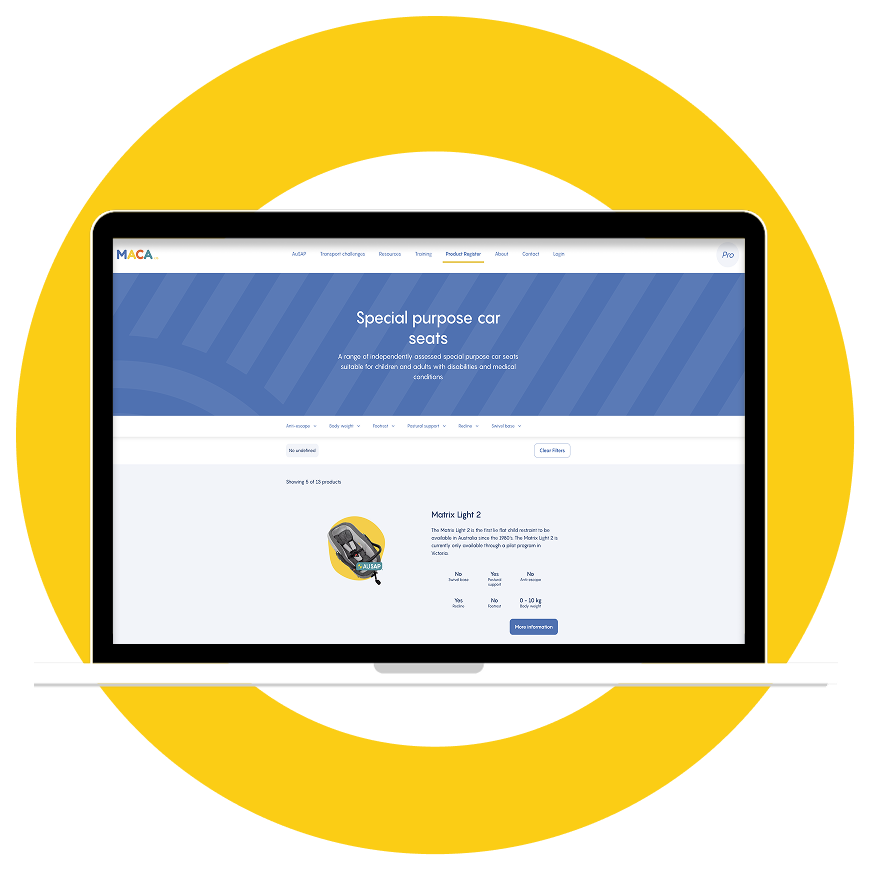 MACA maintains a national product register, providing independent information about vehicle restraint systems used by people with disabilities and medical conditions. The special purpose car seats listed on the national product register have been AuSAP assessed.