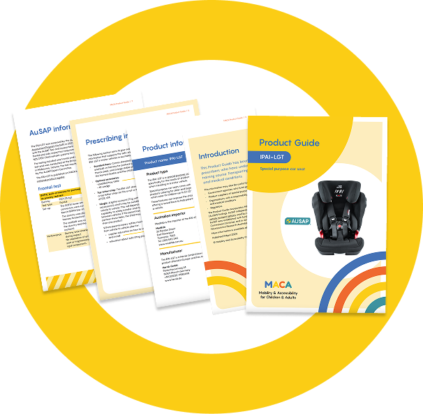 MACA develops product guides for special purpose car seats included on the national product register. The guides bring together important independent information such as AuSAP testing outcomes, safe use, compliance with standards, and prescribing advice.