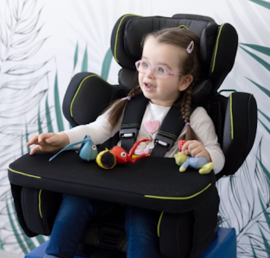The Simon Car Seat is a forward-facing car seat for children between 100-150 cm in height requiring additional postural support.